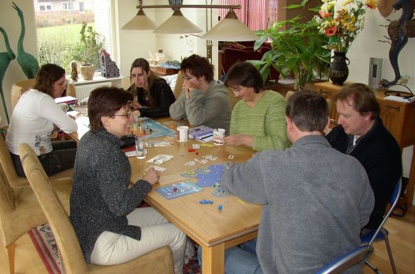 Toen was het tijd voor patat, hamburgers, berehappen en kaassoufflees. De ervaringen van BigKini en Australia werden uitgewisseld en ook werd er een proefrondje Galopp Royal gespeeld. Ondanks de enthousiaste uitleg van Thea bleek dat de spelers niet echt dit enthousiasme deelden. Thea was er al een beetje bang voor, maar voor ons was het toch teveel geluk waarop het spel gebaseerd is. Na één ronde werd het weer ingepakt.