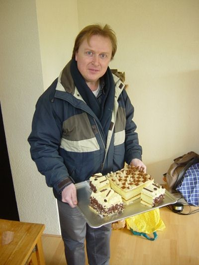 entree, want in zijn handen had hij een taart in de vorm van een schaakbord