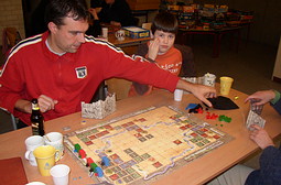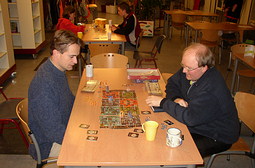 Bij binnenkomst was iedereen net klaar met eten en de onafgemaakte potjes werden vervolgd. Veel gelezen over Dungeon Twister, dus ik keek even mee bij Ronald en Michiel die in een fel gevecht verwikkeld waren. Het spel trok mijzelf niet direct, maar Ronald en Michiel waren er beiden zeer enthousiast over.