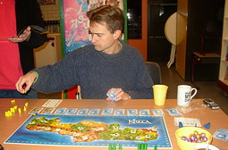 Deze van Phalanx is ook een heel aardige filler. Te spelen in een kwartiertje en de regels zijn in 30 seconden uit te leggen. Met 3 pinguins probeer je zo veel mogelijk vis in te slaan al springend over de ijsschotsen. Wanneer je een ijsschots verlaat pak je de tegel, met daarop een aantal vissen, waar je op stond. Zo ontstaan gaten waar de pinguins niet meer overheen kunnen springen. Het is zo de bedoeling om voor jezelf een mooi geisoleerde ijsschots te creeeren waardoor al deze vis voor jou is. Dat moet je eens een keertje zien en dat zagen we Michiel dus doen. Wederom een overwinning voor deze Phoenix speler.