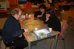 Hierna liepen we met Michiel naar de tafel met de spellen en na wat overleg besloten we Kreta te gaan spelen. Bij ons nog ongespeeld in de kast, maar Michiel had het al eens gespeeld. Leonie schoof ook aan en Lody hielp met de regels. Kreta is een meerderhedenspel met een heel leuk tellingsysteem. Je telt namelijk alle gebieden die grenzen aan een bepaald kruispunt. Het is constant opletten in welke gebieden de meerderheden zich bevinden en aangezien de spelers in hun beurt de telling kunnen veroorzaken is het afwegen of het nou handiger is om de positie op het bord nog verder te verbeteren of dat bij een telling er toch wel meer voordeel behaald kan gaan worden. Als veroorzaker van de telling heb je ook enige invloed over de bepaling van het gebied dat geteld gaat worden nadat het volgende gebied is geteld.