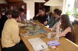 De anderen waren op dat moment nog volop bezig strijd te leveren tegen het spel Shadows over Camelot dus werd besloten Mesopotamië te gaan spelen. Ook hier de tweede maal dat we het speelden en ook dit spel beviel weer goed. Jan Karel had dit ook al eens gespeeld en verzorgde de opfrissing van de regels. Dat hij het spel goed door had en dat hij zich al thuis begon te voelen werd snel duidelijk, vrijwel direct had hij de leiding in het spel te pakken. Aan het eind van het spel profiteerde hij ook optimaal van zijn 3 offerplaatsen die hem na elke beurt veel manna opleverden. Jan Karel was op stoom en op geen enkele manier meer af te stoppen.