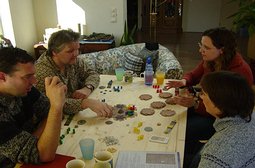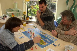 Ook tijdens het tweede potje Kreta bleek dat het een heel erg leuk spel is. De regels hadden we nog even doorgelezen en het bleek dat we het de dag ervoor bijna goed hadden gespeeld. Op Spellenpret hadden we gespeeld dat het kasteel meetelde in de telling van de 7 maximaal te plaatsen personen in een gebied, die tellen dus eigenlijk niet mee. Tijdens het spelen vergiste menigeen zich wel weer eens in de gevolgen van bepaalde tellingen. Jan Karel moest nog even wennen aan de entourage, maar de anderen waren verwikkeld in een felle strijd om de meerderheden. Sarah bleek uiteindelijk net even beter uit te komen en had de winst te pakken.