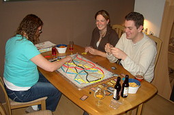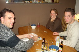 Ipv een bloemetje hadden we Bohnanza (maar dan de versie van het vertaalinstituut uit Almere) meegenomen als kadootje. Dat werd uitgepakt en moest natuurlijk gespeeld worden. Dit bleek iets minder eenvoudig dan Ticket to Ride. Na een paar rondjes werd het allemaal wel duidelijker en kon er op hoog niveau hard onderhandeld worden over de bonen. Barry bracht een geheel nieuwe manier van onderhandelen ter berde, hij wilde een kaart wel ruilen maar niet zeggen welke bonenkaart hij dan aan de andere speler gaf. Origineel, maar geen speler die hierin meeging. (Moeten we met keukens maar eens gaan proberen, eerst de klant laten zeggen of hij de keuken koopt om daarna de korting te bepalen)
