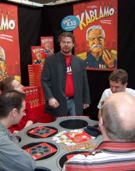 Op dezelfde verdieping was ook de stand met Kablamo. We hadden gisteren afgesproken dat we het zouden komen proberen, dus daar hielden we ons aan. Vincent, Jeroen, Monique, Lody en Rogier waren de slachtoffers. Het werd zoals verwacht een chaotisch spelletje. Omdat nog onbekend was welke kogels er in het spel zaten, moest er eerst goed gelezen worden. Langzaam maar zeker kwam er lijn in het spel. Er kwam schot in het spel toen Vincent zich door zijn hoofd schoot en tegelijkertijd ook Jeroen uitschakelde. Niet lang daarna volgde ook Monique. Lody wist uiteindelijk de strijd van Rogier te winnen. Bij deze stand was ook het spel Spank the Monkey verkrijgbaar. Sandra en Caroline vermaakten zich met een prachtige 3D versie. En natuurlijk werden er ook T-shirts van Spank the Monkey gekocht.